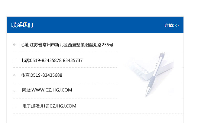 地址:常州市新北區友邦商務大廈1幢16、17層  電話:0519-85101652  傳真:0519-85112595  郵編:213022  網址:www.cz-jiayue_cn.wxkssj.com  郵箱:xiajifengaa@163.com